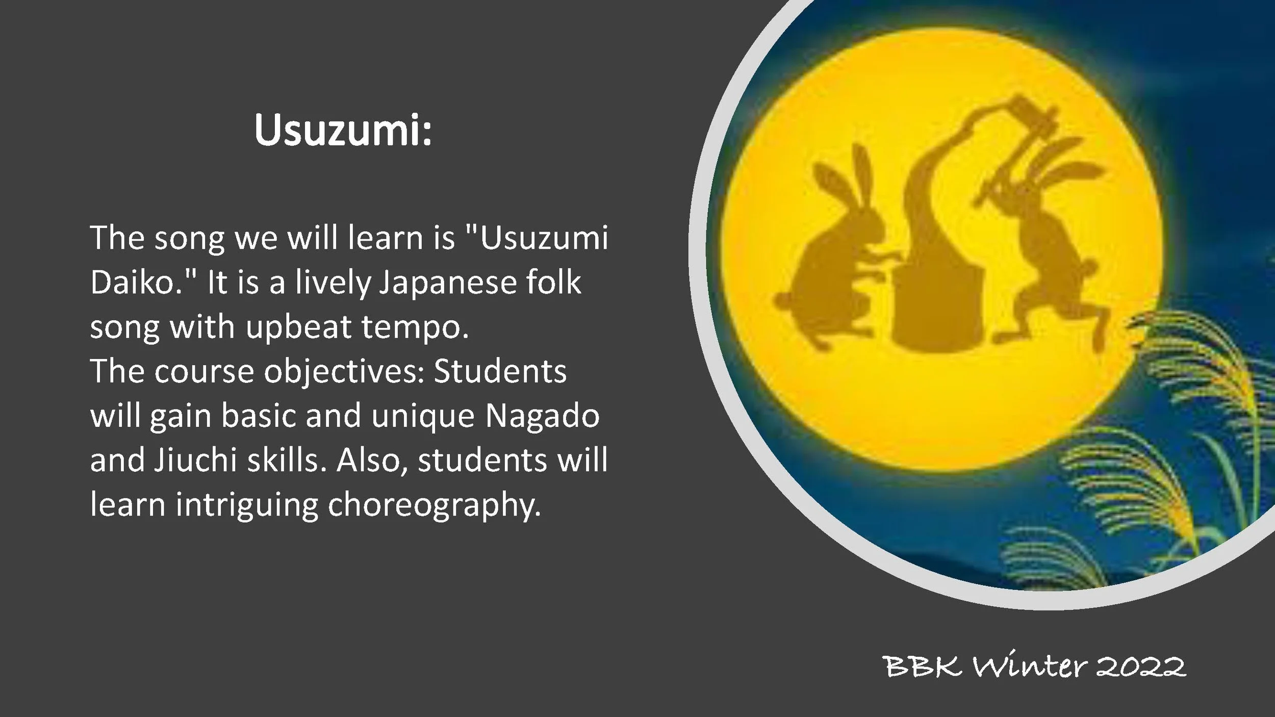 The song we will learn is "Usuzumi Daiko." It is a lively Japanese folk song with upbeat tempo.